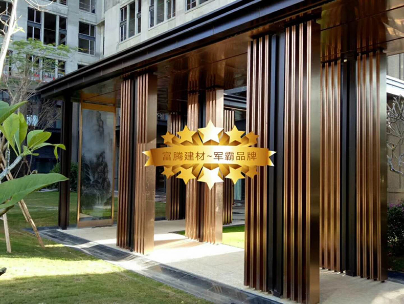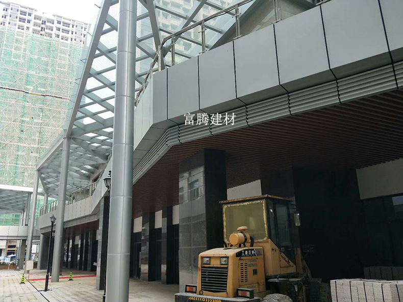 案例地點:東莞魯能公館 使用產品:雨棚鋁單板、造型鋁方通 工程面積:5000方 提供服務:設計>生產>安裝一站式服務